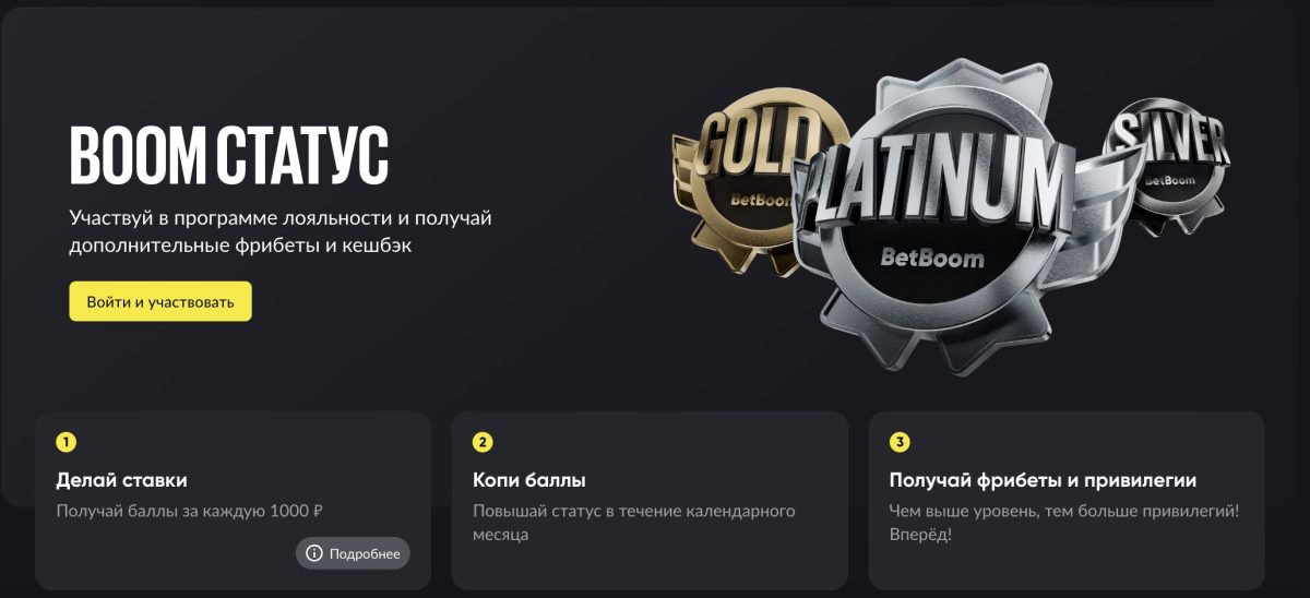 БетБум промокод на Октябрь 2025 – 10 000 рублей 14 октября 2025 |Эдгар Виннер БетБум промокод на пять фрибетов общим номиналом в 10 000 рублей — это эксклюзивный приветственный бонус для новых клиентов букмекерской конторы. Активировать промокод можно только по нашей ссылке, ведущей на промо-страницу BetBoom. Зарегистрируйтесь, завершите идентификацию, внесите депозит от 1000 рублей и получайте столько фрибетов, сколько пожелаете. Что такое Бетбум промокод? БетБум промокод — это уникальное сочетание символов, которое открывает двери к щедрым бонусам от BetBoom. Промокод дает возможность получить разнообразные бонусы в букмекерской конторе: реальные деньги для ставок, бесплатные ставки, кэшбэк и многое другое. Новые пользователи могут воспользоваться эксклюзивным предложением от букмекера и портала «vRINGe». Перейдите по бонусной ссылке, зарегистрируйтесь, внесите депозит от 1000 рублей и получите первый из пяти фрибетов. Выполняйте условия по ставкам и заберите еще четыре фрибета. Общая сумма бонуса составляет 10 000 рублей. Бетбум промокоды на сегодня Бонус Описание Как получить бонус Фрибет за регистрацию до 10 000 рублей Активировать промокод Кэшбэк До 20% Активировать промокод Как активировать промокод Бетбум при регистрации? Активация промокода Бетбум происходит автоматически на первом этапе при переходе по нашей ссылке на страницу регистрации в букмекерской конторе. Вам не нужно вводить бонусный код, просто завершите регистрацию, и приветственный бонус будет закреплен за вашим аккаунтом. Останется только выполнить условия по депозиту и ставкам, чтобы разблокировать каждый из пяти фрибетов. 1. Активируйте БетБум промокод Нажмите на кнопку “Активировать” в БетБум купоне, чтобы перейти на сайт букмекера по бонусной ссылке и активировать промокод. 2. Заполните форму регистрации Укажите номер телефона, дату рождения и придумайте надежный пароль. Завершите регистрацию, нажав на кнопку “Зарегистрироваться” или авторизуйтесь через Сбер или Т-Банк. 3. Подтвердите регистрацию Введите на сайте код подтверждения от BetBoom полученный по СМС на указанный номер телефона. 4. Пройдите идентификацию Если у вас уже есть действующие аккаунты в других БК, то идентификация в Бетбум займет не более пары минут. Вы можете пройти упрощенную идентификацию на сайте БК, заполнив форму с данными или полную верификацию через Сбер ID, T-ID или Госуслуги. Все бонусы за промокод Бетбум Мы подготовили для вас описание каждого бонуса, который вы получите, если активируете BetBoom промокод при регистрации нового аккаунта. Вся информация взята с сайта букмекера и адаптирована для более легкого восприятия и экономии вашего времени. 1. Эксклюзивный приветственный фрибет по промокоду в БетБум Эксклюзивный БетБум промокод подарит каждому новому клиенту возможность получить 5 фрибетов на общую сумму 10 000 рублей. Итоговое количество фрибетов будет зависеть от суммы ставок, которую вы проставите за 7 дней с момента первого заключенного пари на сайте букмекера. Не пугайтесь, в условиях акции нет ничего страшного, наоборот, они очень гибкие и позволяют каждому игроку выбирать, сколько фрибетов получить. Условия бонуса за Бутбум промокод Если простыми словами описать суть акции, то вам нужно в течение первых семи дней после регистрации просто заключать пари, выполняя условия по сум