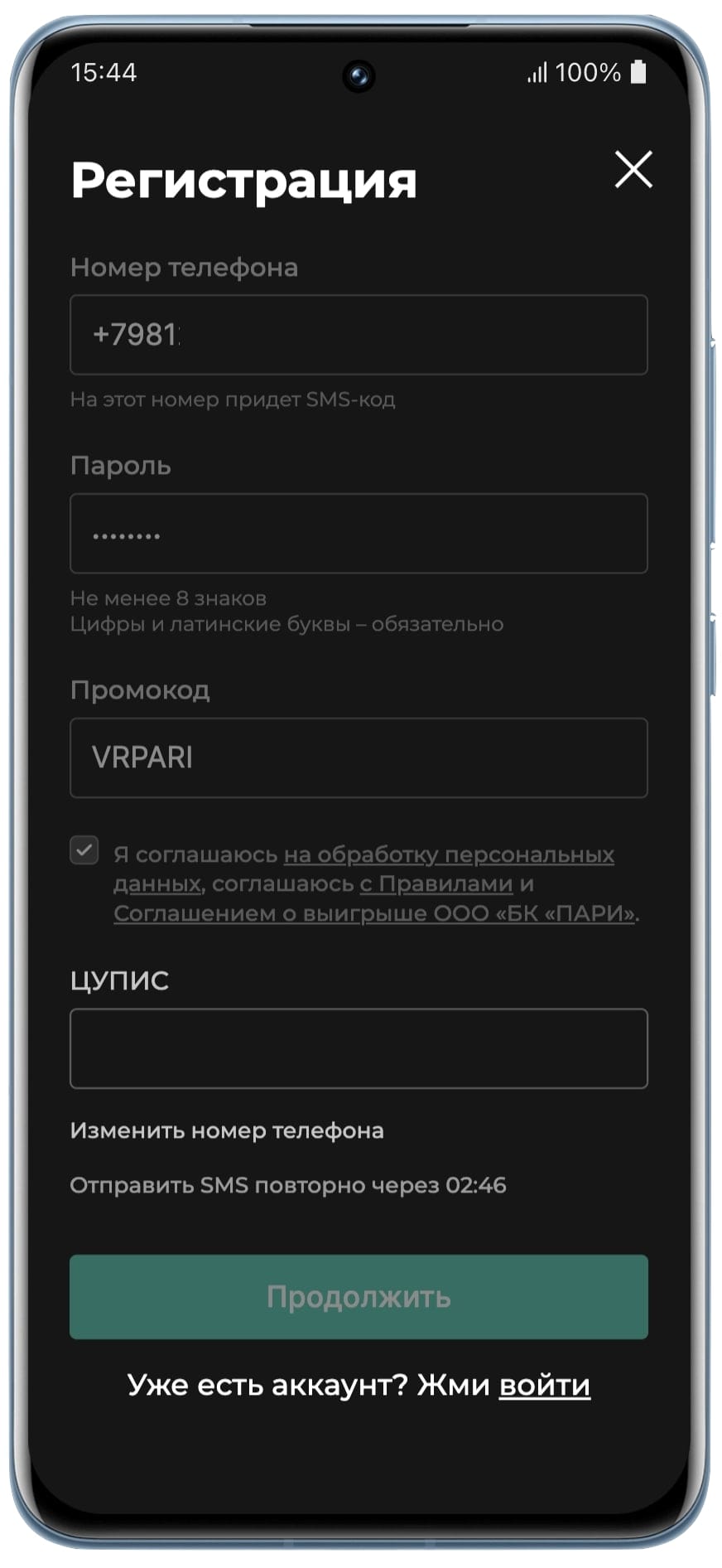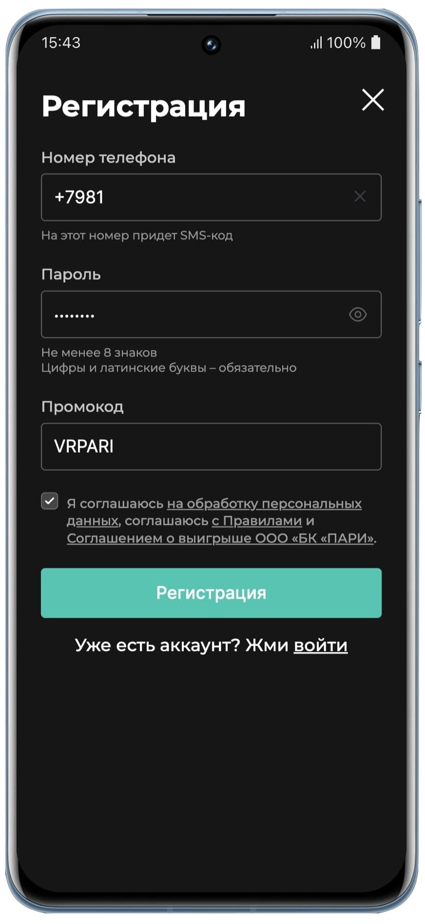 Промокод Пари – VRPARI на Октябрь 2025 до 10 000 руб. 20 октября 2025 |Эдгар Виннер Промокод Пари 2025 — VRPARI и VR5000 активируется при регистрации. Новый игрок может выбрать бонус на депозит 10 000 руб. или 5 фрибетов по 1000 руб. Код вводится в поле «Промокод» во время создания аккаунта. Что такое промокод Пари 2025? Промокод Пари 2025 — VRPARI и VR5000 открывающие на выбор два типа бонусов: кэш бонус и фрибеты за выполненные условия. Использовать промокод можно только один раз во время заполнения регистрационной формы на сайте букмекера, вписав его в соответствующее поле «Промокод». Промокод VRPARI дает 10 000 рублей за первый депозит Бонусный код VR5000 откроет 5 фрибет ставок по 1000 рублей за депозит от 1000 рублей и оборот по ставкам Важно! Выбрать можно только один промокод для регистрации одного аккаунта. Скопируйте выбранный код активации и используйте его во время создания новой учетной записи на сайте или в мобильном приложении БК Пари. Действующие промокоды Пари Промокод Пари Бонус Условия Активировать промокод VRPARI 10 000 ₽ Регистрацию + депозит Активировать промокод VR5000 5000 ₽ Регистрация + депозит + ставки Активировать промокод Лучшие бонусы недели от БК Пари Получить Возврат суммы ставки 5 rating Страховка ставки Собирайте экспресс ставки 6+ событий в купоне с коэффициентом от 1.6 для каждого из них. В случае, если одно событие не сыграет, PARI вернет всю сумму ставки, без ограничений по сумме. Получить Фрибет 5000 руб. 5 rating Pari Pro Tour Создайте собственного персонажа (имя, внешность, аватар), который будет участвовать в виртуальном теннисном сезоне, повторяющем календарь реальных турниров. Делайте ставки на реальные теннисные матчи и получайте ежедневные бонусы и еженедельный фрибет. Участвовать 50 000 руб. + скины 5 rating Pari Pass Выполняйте ежедневные задания, собирайте внутриигровые монеты и обменивайте их на скины и фрибеты в магазине PARI. Участвовать 300 000 руб. 5 rating Мятный шлем Все сделанные ставки на турниры большого шлема идут в зачет. Заработанные очки помогут попасть в ТОП 100 по итогам акции и получить фрибет от 10 000 до 300 000 руб. + оплаченная поездка на финал любого турнира большого шлема. Регистрация с Пари промокодом Теперь ответим на один из главных вопросов: как активировать промокод Пари, чтобы он гарантированно сработал? Ниже представлена инструкция последовательных действий по активации бонусного кода: 1. Откройте сайт или мобильное приложение Пари и нажмите кнопку «Регистрация». 2. Заполните регистрационную форму и укажите промокод Пари VRPARI (как на скрине) или VR5000, если ваш выбор пал на пять фрибетов по 1000 рублей. 3. Введите адрес электронной почты, который будет использован для восстановления доступа к аккаунту, если номер телефона будет утерян или заменен. 4. Подтвердите регистрацию аккаунта с помощью кода полученного от ЦУПИС на указанный номер телефона во время регистрации. Идентификация аккаунта в Пари Любой бонус по промокоду в Пари не может быть предоставлен, пока зарегистрировавшийся игрок не пройдет обязательную идентификацию личности. Легальные букмекерские конторы по закону обязаны верифицировать каждого клиента, прежде чем откроется доступ к любым акциям и ставкам на сайте или в мобильном приложении. В БК PARI есть два вида идентификации, базовая и продвинутая. Базова идентификация Базовая идентификация в букмекерской конторе PARI – это упрощенный вариан